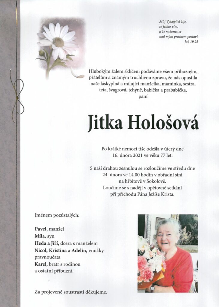 Se smutkem, ale s nadějí v srdci vám sdělujeme, že nás dne 16. 2. 2021, ve věku 77 let dočasně opustila naše milovaná sestra Jitka Hološová, manželka kazatele Českého sdružení.