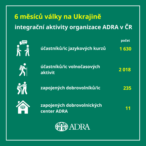 Kromě pomoci přímo na Ukrajině realizujeme i řadu aktivit pro uprchlíky v Česku. Dobrovolnická centra ADRA se od začátku války podílela na asistenci nově příchozím v rámci Krajských asistenčních center na pomoc Ukrajině. Jen v Moravskoslezském kraji se prostřednictvím dobrovolnických center v Ostravě, Frýdku-Místku a Havířově zapojilo 1293 dobrovolnic a dobrovolníků, kteří pomoci věnovali 16 322 hodin (680 dní). Pomáhali na nádražích, s registracemi, chodem asistenčních center, výdejem humanitární pomoci, ale třeba i s hlídáním dětí či tlumočením. V posledních týdnech se dobrovolnická centra zaměřují především na integraci uprchlíků – jazykové kurzy, volnočasové aktivity či konverzační setkávání. Pomáhá nám 200 dobrovolnic a dobrovolníků. Jen do jazykových kurzů se zapojilo již více než 1600 nově příchozích lidí z Ukrajiny a do volnočasových aktivit přes 2000 dospělých a dětí.